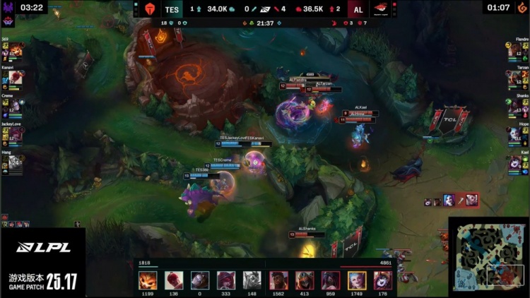 中期Tarzan劫带队继续入侵TES野区,厄塔汗团战Hang洛进场失误送王杰金克丝启动,Tarzan劫连杀Kanavi和Creme,AL拿到4k经济领先。