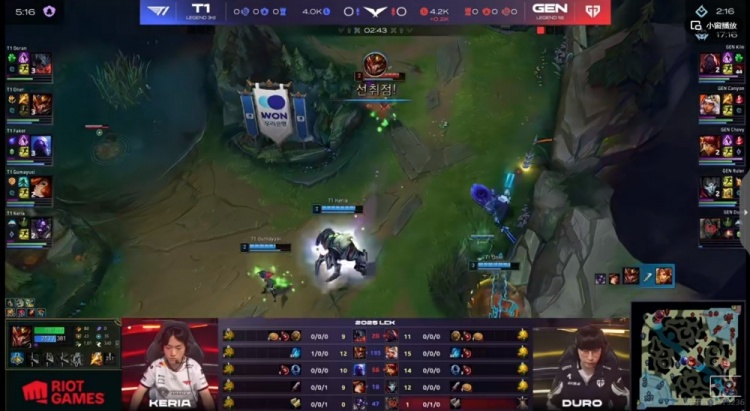 【2:43】Oner皇子再次3级抓下,Keria牛头先手留住了Duro曙光!Duro交闪之后还是被皇子跟闪黏住,Oner配合下路双人组将曙光击杀,拿到一血!