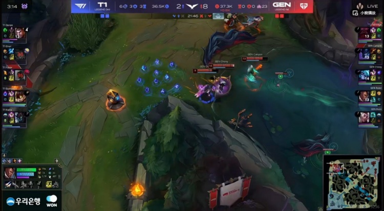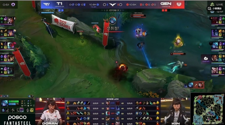 【10:30】河道团,Canyon梦魇开飞正面GEN三打二直接集火秒掉了Oner莉莉娅!Chovy薇古丝交闪再击杀Keria大树!这波打完Chovy薇古丝2-0的开局了!T1不过让炸弹人换掉了GEN下一塔!