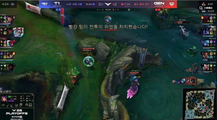 【30:30】中路遭遇,GEN直接关灯+奥恩大招直接越塔秒了T1上辅!侧翼Gumayusi炸弹人也被留住!GEN打出0换3,从中路拆掉高地+一座门牙塔想撤!Gumayusi炸弹人TP绕后但是正面Doran杰斯瞬间已经没了!GEN逐个击破完成对T1的团灭,结束本场BO5,也让T1成为了今年世界赛LCK的四号种子!
