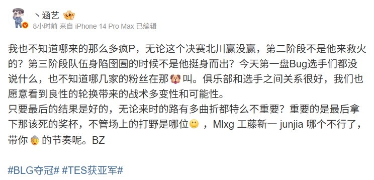 直播吧9月22日讯 LPL总决赛BLG战胜TES后,电竞经纪人涵艺发文:
