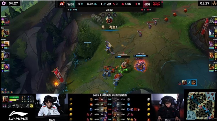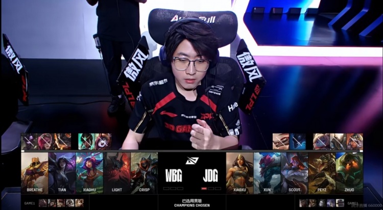 WBG:上单Breathe、打野Tian、中单Xiaohu、下路Light、辅助Crisp