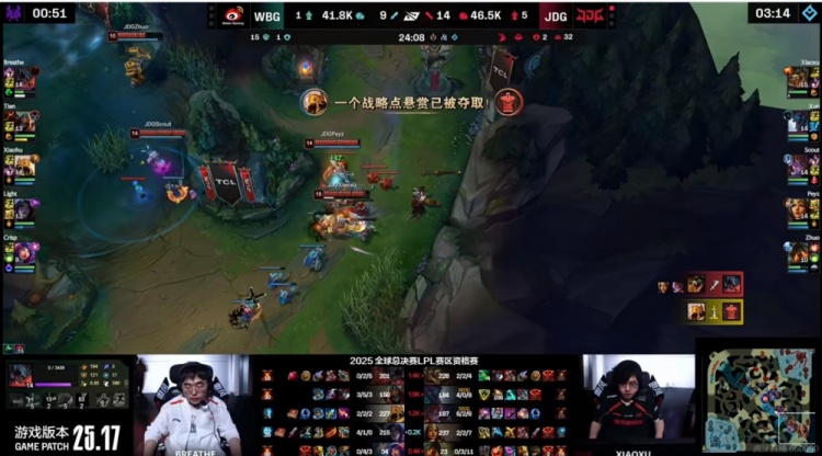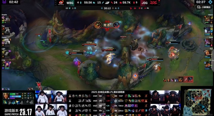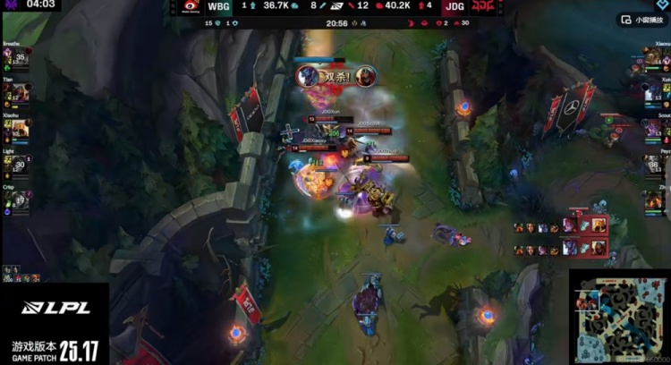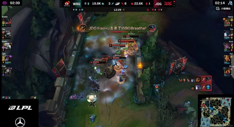 【24:08】Breathe剑魔下路草里回城被JDG四人逮捕!WBG则是换掉了战略点中一塔!