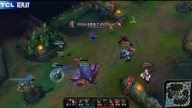 后期龙魂团GALA希维尔瞬间被Xiaoxu兰博融化,JDG轻松拿到水龙魂,中路一波冲上iG高地打出0换4,击杀比锁定在1-16,JDG推平iG基地先下一城。