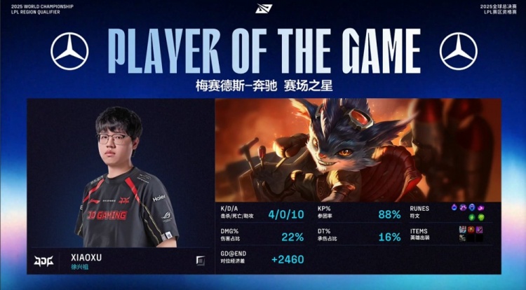 第一局前期巢虫团iG上中野辅瞬间被融化,随后Xun潘森开大飞上逮捕TheShy奥恩,JDG早早听牌水龙魂。