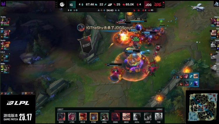 【15:25】TheShy剑魔下路被Scout瑞兹TP来下打残,Peyz吉格斯与其拉扯,一记远投三分击杀TheShy,JDG经济领先1k。