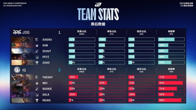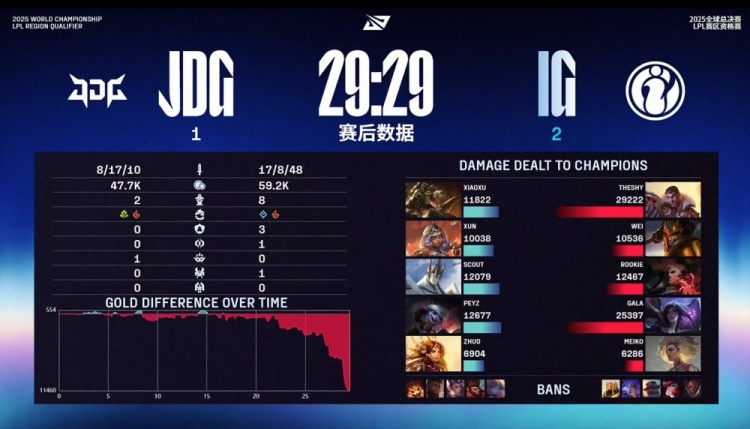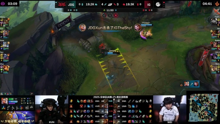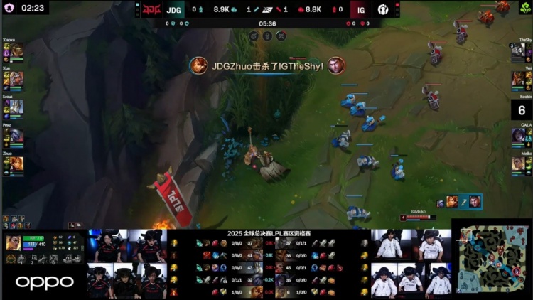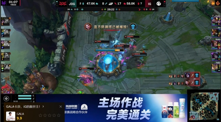 后期大龙团,Xiaoxu鳄鱼草丛落单先被GALA融化,随后GALA卡莎飞脸瞬间拿到三杀,iG打出0换4回头吃掉大龙,经济领先5k。最终iG下路推进瞬间刷屏融化JDG,一波0换5推平JDG基地,iG拿到赛点。