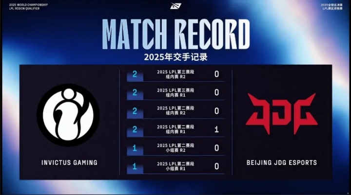 直播吧9月27日讯 在今天冒泡赛直播流中,官方分享了IG与JDG的2025年的交手记录,其中IG在今年保持了对JDG的六连胜(含BO1)。