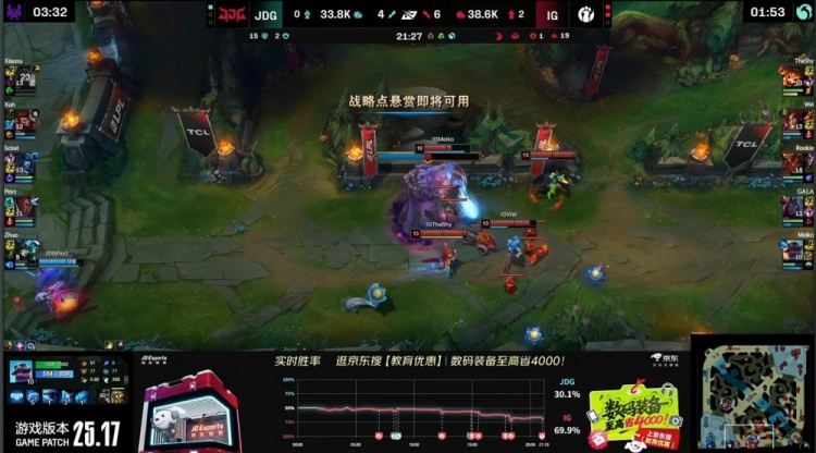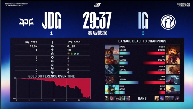 中期Peyz卢锡安上头野区追击GALA被后者闪现拉开,Meiko布隆反手RQ吃掉人头,Rookie岩雀上路被抓,iG趁机推掉JDG中路一塔并听牌水龙魂。后续TheShy纳尔自家野区被Xun带队抓掉,JDG回头开厄塔汗,Wei婕拉进场抢掉厄塔汗,Xiaoxu奎桑提被留下人头,iG推掉JDG下路二塔,经济领先6k。