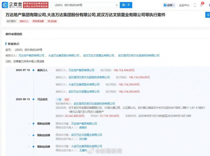直播吧09月28日讯 企查查APP显示,近日,大连万达集团股份有限公司及其法定代表人王健林等被限制高消费。案件流程显示,此前,大连万达集团股份有限公司、万达地产集团有限公司等因此案被强制执行1.86亿。