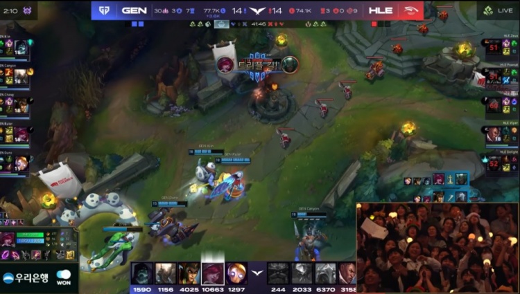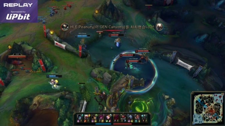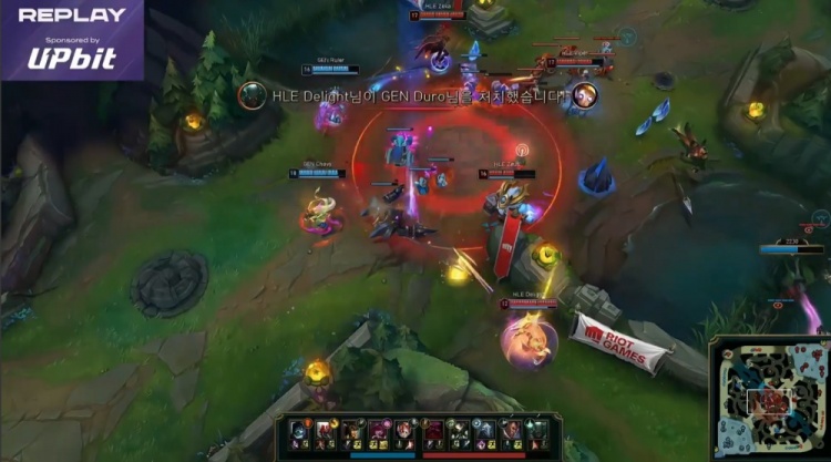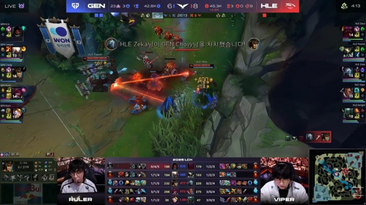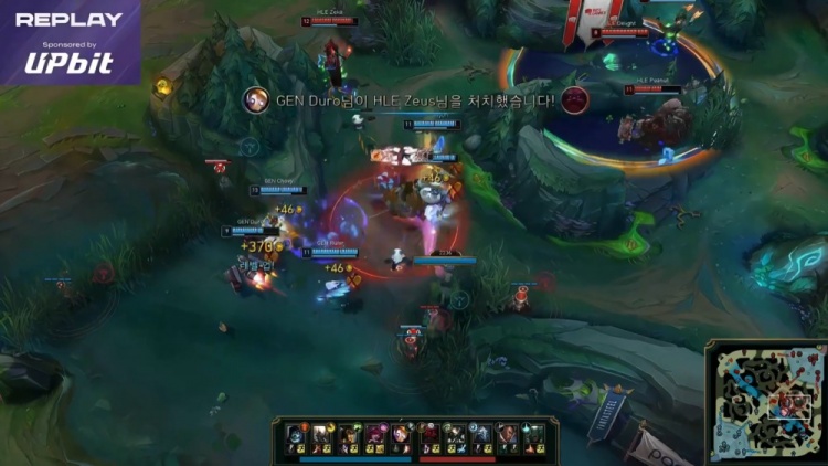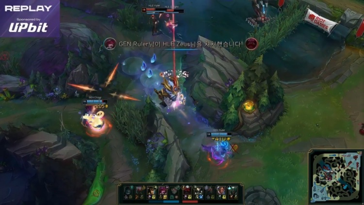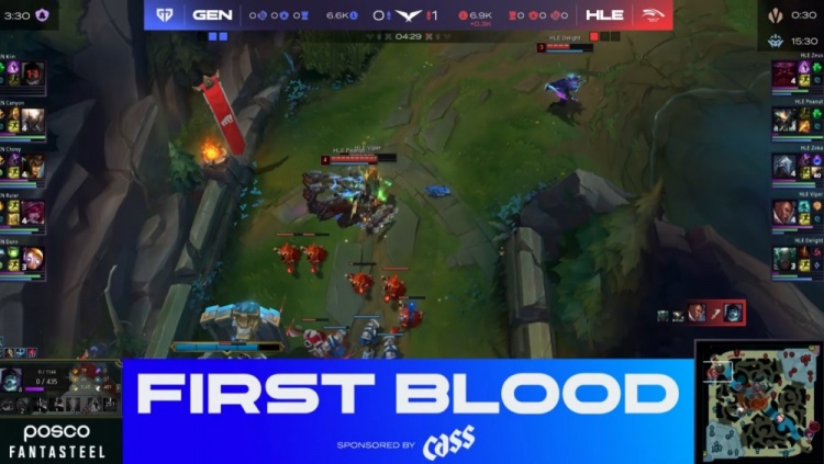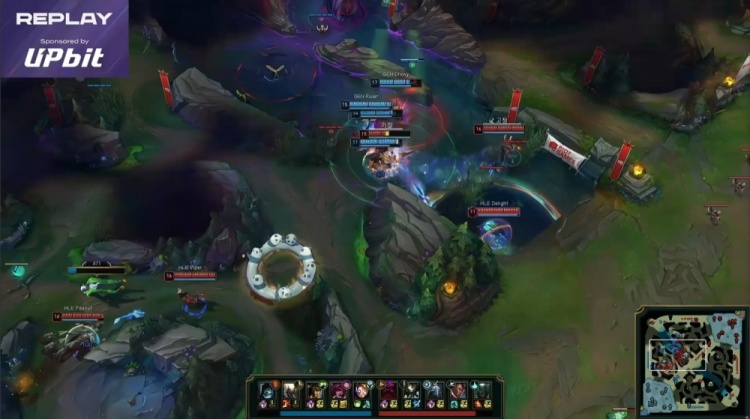 中期Delight派克中路绕后逮捕被Viper打残的Ruler,小龙团Duro机器人钩回宙斯奥恩将其击杀,GEN轻松拿到厄塔汗,但经济落后2k。后续双方中路大乱斗,Kiin掘墓不断赴死,HLE经济领先3k。