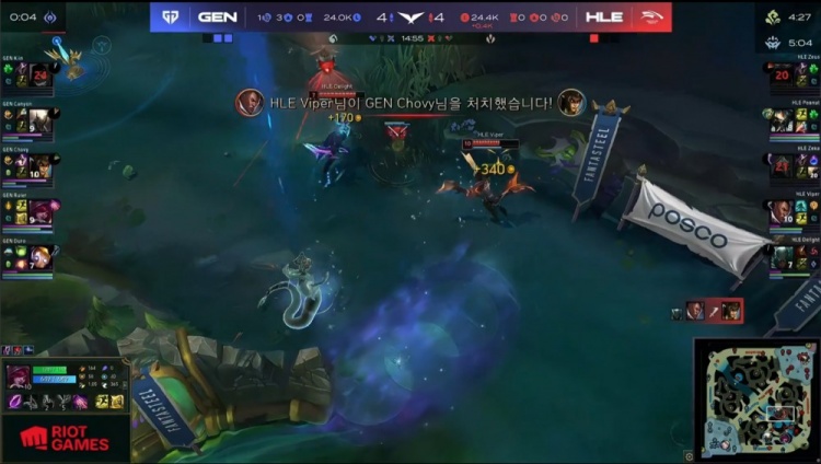 【14:19】小龙团,Duro机器人钩到小花生蝎子与之互换,Delight派克将其斩掉,GEN追击杀掉HLE中上,但Delight派克反手斩GEN两人,Viper收掉残血Chovy蛇女, 双方打出3换3,经济持平。