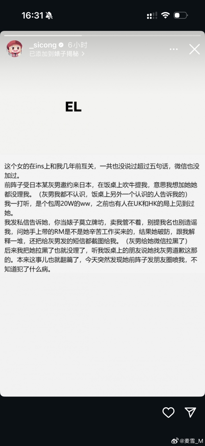 前阵子受日本某灰男邀约来日本,在饭桌上吹牛提我,意思我想加她她都没理我。(灰男我都不认识,饭桌上另外一个认识的人告诉我的)我一打听,是个包周20W的ww,之前也有人在UK和HK的局上见到过她。我发私信告诉她,你当婊子莫立牌坊,卖我管不着,别提我名也别造谣我,问她手上带的RM是不是她辛苦工作买来的,结果她破防,跟我解释一堆,还把给灰男发的短信都截图给我。(灰男给她微信拉黑了)后来我把她拉黑了也就没理了,听我饭桌上的朋友说她找灰男道歉这那的。本来这事儿也就翻篇了,今天突然发现她前阵子发朋友圈喷我,不知道犯了什么病。”