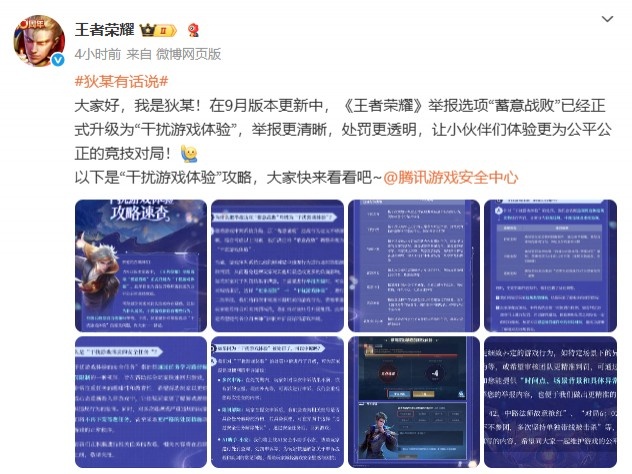 腾讯《王者荣耀》官方今日宣布,在 9 月版本更新中,《王者荣耀》举报选项“蓄意战败”正式升级为“干扰游戏体验”,举报更清晰,处罚更透明,让玩家体验更为公平公正的竞技对局。