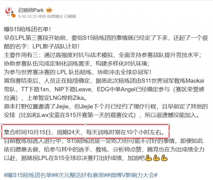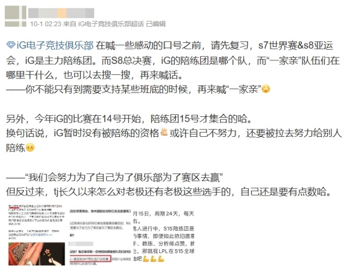 直播吧10月2日讯 此前有博主爆料LPL的S15陪练团阵容,并透露陪练团的集合时间在10月15日,根据赛程15日是S15瑞士轮首日,而入围赛iG对阵T1的比赛在14号,所以此次陪练也让不少iG粉丝不满,纷纷指责集合时间太晚,压根没管iG死活!