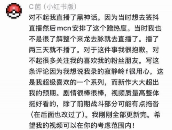 随后,“渗透之C君”表示自己在当时录制《寂静岭f》实况时的压力非常大,同时也很在意数据。“加上除去战斗因素我对自己的视频很满意,希望更多喜欢寂静岭的人可以看到,所以当我看到有因为我曾经的行为而抵制我的新视频的言论出现的时候,心里很不是滋味。我的视频真挺好看的,但我也的确惹人不开心了。于是那条评论就打出来了。文字被断章取义,于是我被骂了。”