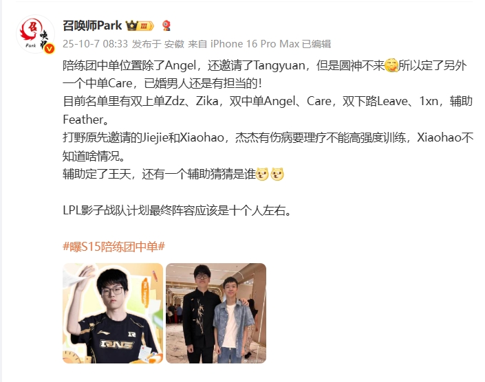 “双上单Zdz/Zika、双中单Angel/Care、双下路Leave/1xn、辅助Feather、打野原定Jiejie/Xiaohao;影子战队计划最终阵容应该是十个人左右”