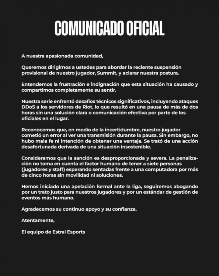 我们已正式向联赛官方提出申诉,将继续为选手争取公平的待遇以及推动更人性化的赛事管理标准。