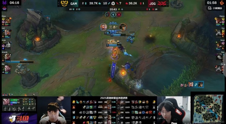 【20:16】河道团战第一波GAM强开Peyz卡莎失败,Aress瑞兹被集火强杀!但是JDG想追击没人吃得住GAM下野的伤害啊!野辅阵亡之后Peyz卡莎又吃到Elio洛的抬,这时候Levi琪亚娜第二个大都转好了啊!最终Levi琪亚娜三杀,GAM打出1换4之后拿下厄塔汗!4K经济差!