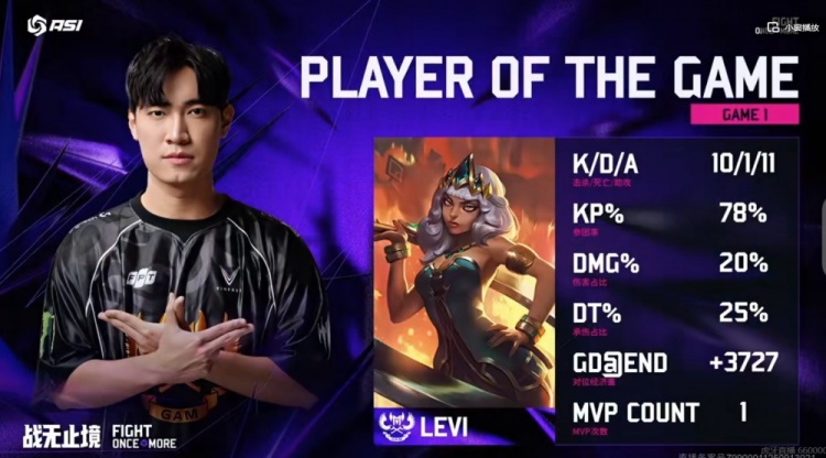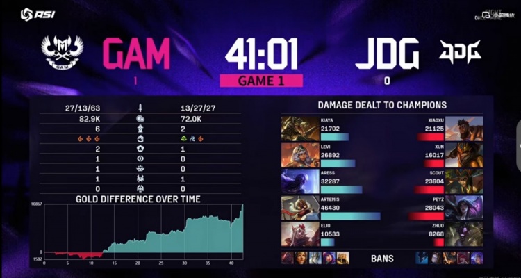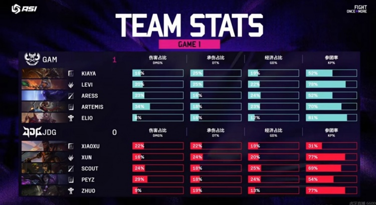 首局比赛Xun皇子前期疯狂gank中路,帮助Scout蛇女连续逮捕Aress瑞兹,蛇女一度4-0开局!但是10分钟过后JDG连续给到机会,GAM连续找到节奏合计打了个0换4之后领先2K优势,JDG也拿不到自己的第三条小龙!随后的团战中Levi琪亚娜团战连续开推,帮助双C完成收割!JDG这边没有人吃得住伤害,也只抓住了Levi带复活甲脸探草的一波机会最终还只是个3换3!JDG后期已经没有足够伤害,火龙魂团正面GAM打出0换3,一波结束首局!