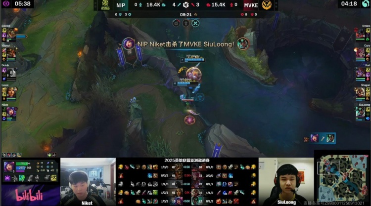 【5:38】Gury蔚继续来下gank,SiuLoong卡尔玛打残Leave,Gury蔚再杀Leave,Niket妮蔻自家塔前定住SiuLoong将其反杀,双方打出1换1,NIP经济领先1k。