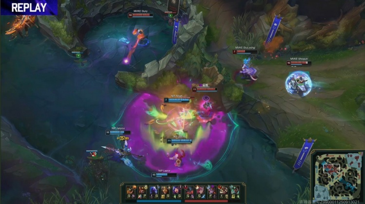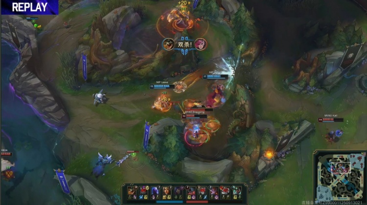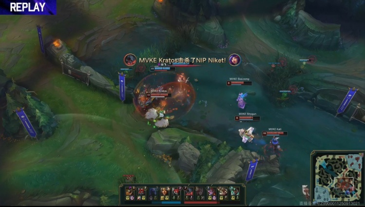 【19:33】MVKE中路推掉NIP一塔,中路团战,Doinb瑞兹开车送Niket妮蔻进场击杀Kratos剑魔,双方拉开,本局为风龙魂。