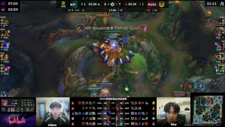 【17:55】NIP继续冲进MVKE野区,Solokill鳄鱼配合naiyou皇子盖帽击杀Gury,NIP经济领先4k。