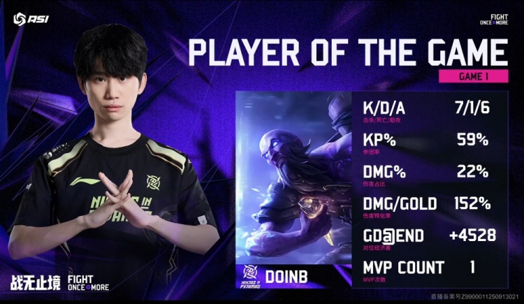 中期NIP三人上路越塔击杀Kati阿萝拉后推掉MVKE上路一塔,Doinb瑞兹多次进场带走关键人头,NIP逐渐拉开经济差距。后续厄塔汗团中,naiyou皇子拿下厄塔汗后NIP打出2换5,Doinb瑞兹砍下三杀。