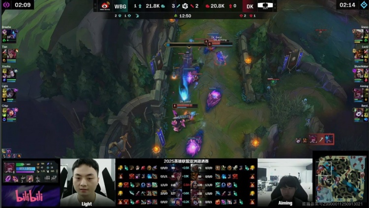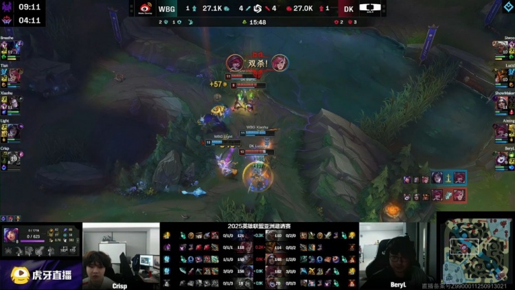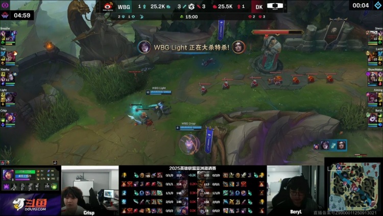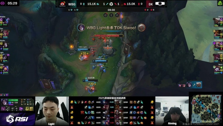 【25:26】WBG入侵DK野区,刘神妮蔻反开,Light与Breathe联手击杀DK中野,WBG打出0换2回头吃掉大龙,经济领先1w。