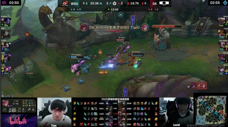 【20:43】WBG来开厄塔汗,Lucid皇子姗姗来迟,小天拿到厄塔汗,上路团战,Lucid皇子扣三人,小天反手一拳轰掉Siwoo,Light卡莎飞进场内击杀Aiming,WBG打出0换4,经济领先7k。
