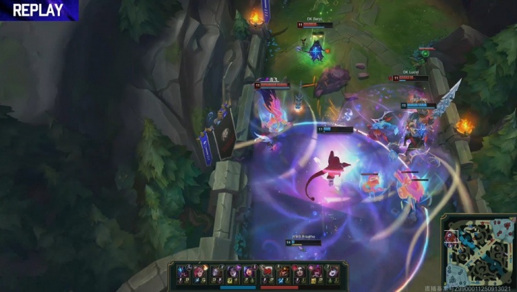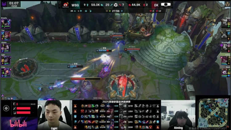【27:10】WBG上路推进,Siwoo安蓓萨锁头Light但没伤害,Light反手将其击杀,WBG轻松冲上DK高地将其击溃,一波推平DK基地先下一城。
