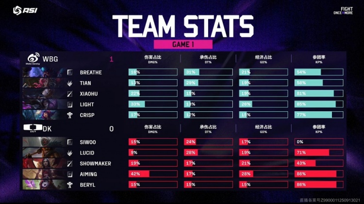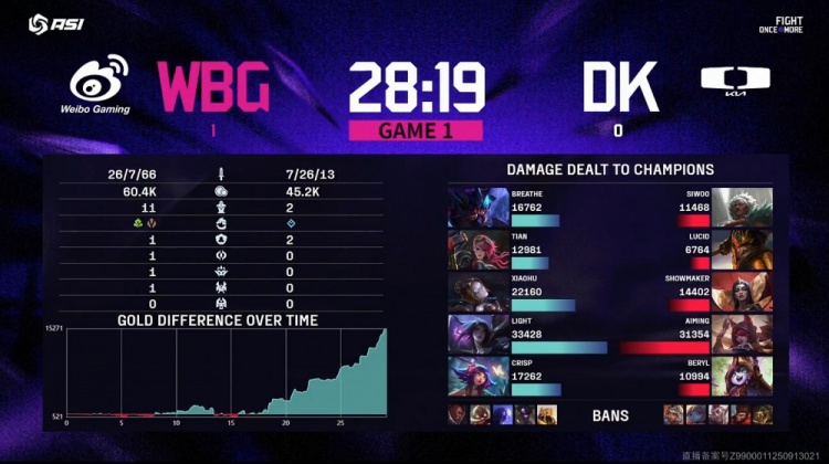 后期刘神继续带领WBG强势入侵DK野区打出0换2,WBG吃掉大龙经济优势来到1w以上。最终WBG上路推进,Light卡莎轻松双杀,WBG一波推平DK基地先下一城。