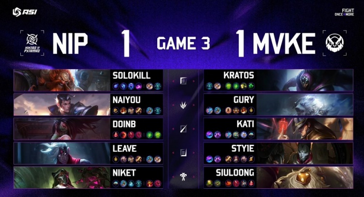 第三局前期Kati卡牌飞上配合Kratos贾克斯击杀Leave韦鲁斯拿到一血,MVKE下路越塔再杀Solokill酒桶,随后Gury狗熊与Sty1e烬在上路扩大优势,NIP前期处于劣势。