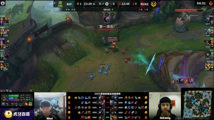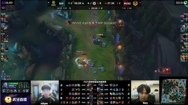 【12:25】NIP两人上路越塔击杀Kati卡牌,Gury天熊下凡狂拍双杀,MVKE打出1换2,经济领先1k。