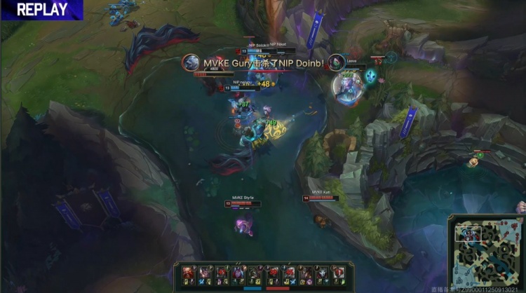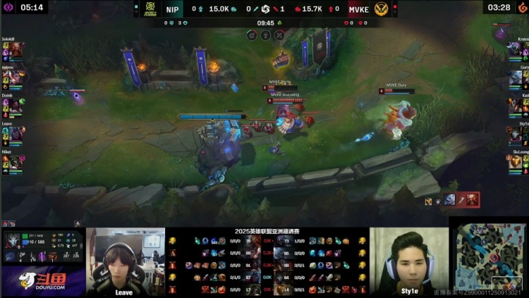 【9:48】MVKE三人下路越掉Solokill酒桶,随后Leave与Niket上路被留,Sty1e烬架狙击杀Leave,Gury狗熊拍脸再杀Niket,Doinb阿卡丽姗姗来迟,MVKE打出0换2,经济领先2k。