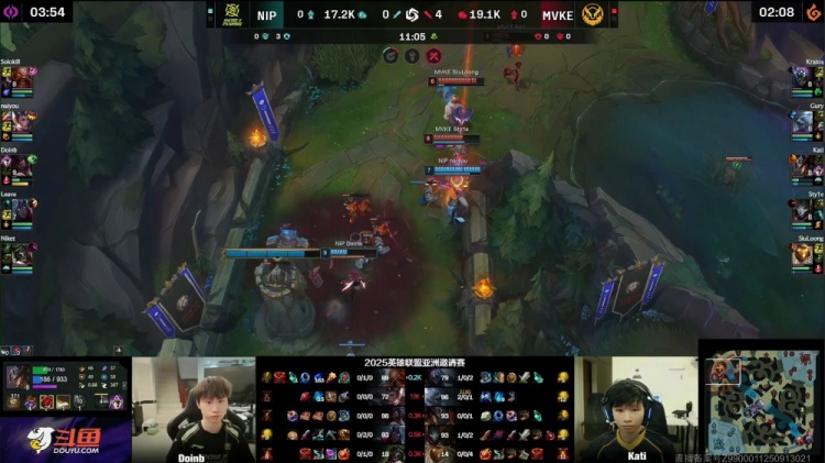 【10:55】Doinb阿卡丽上路塔下半血肉身留人,naiyou赵信来上隔墙捅飞Sty1e烬,Doinb阿卡丽进场换掉单杀Kati卡牌被换,NIP打出1换2。