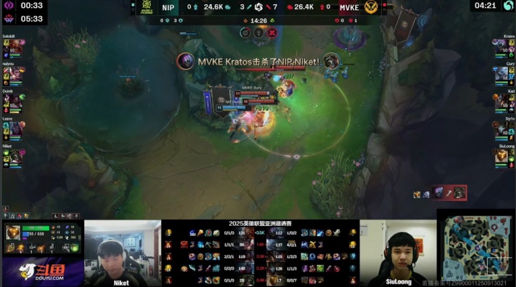 【24:34】小龙团,Gury先被Doinb阿卡丽打掉半血,SiuLoong巴德想进门被Niket烈娜塔拉回,Doinb拿到人头,随后naiyou赵信捅飞Kratos贾克斯,NIP继续推进,naiyou赵信没大捅Gury被反杀,NIP上辅跟着阵亡,双方打出3换3,MVKE听牌水龙魂。