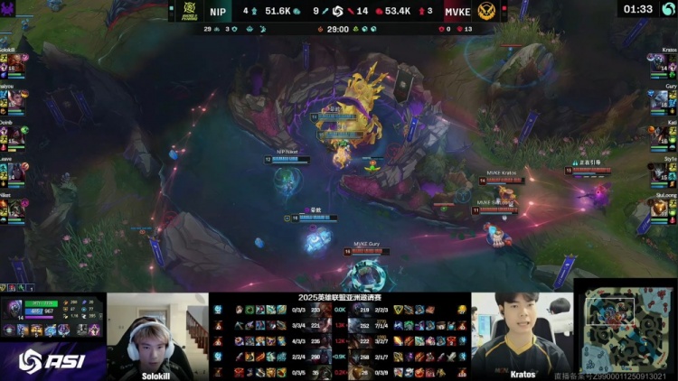 【29:05】大龙团x2,NIP大龙埋伏,MVKE五人掉线,Gury狗熊被杀,比赛暂停。