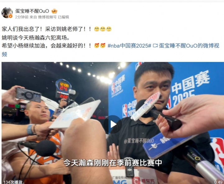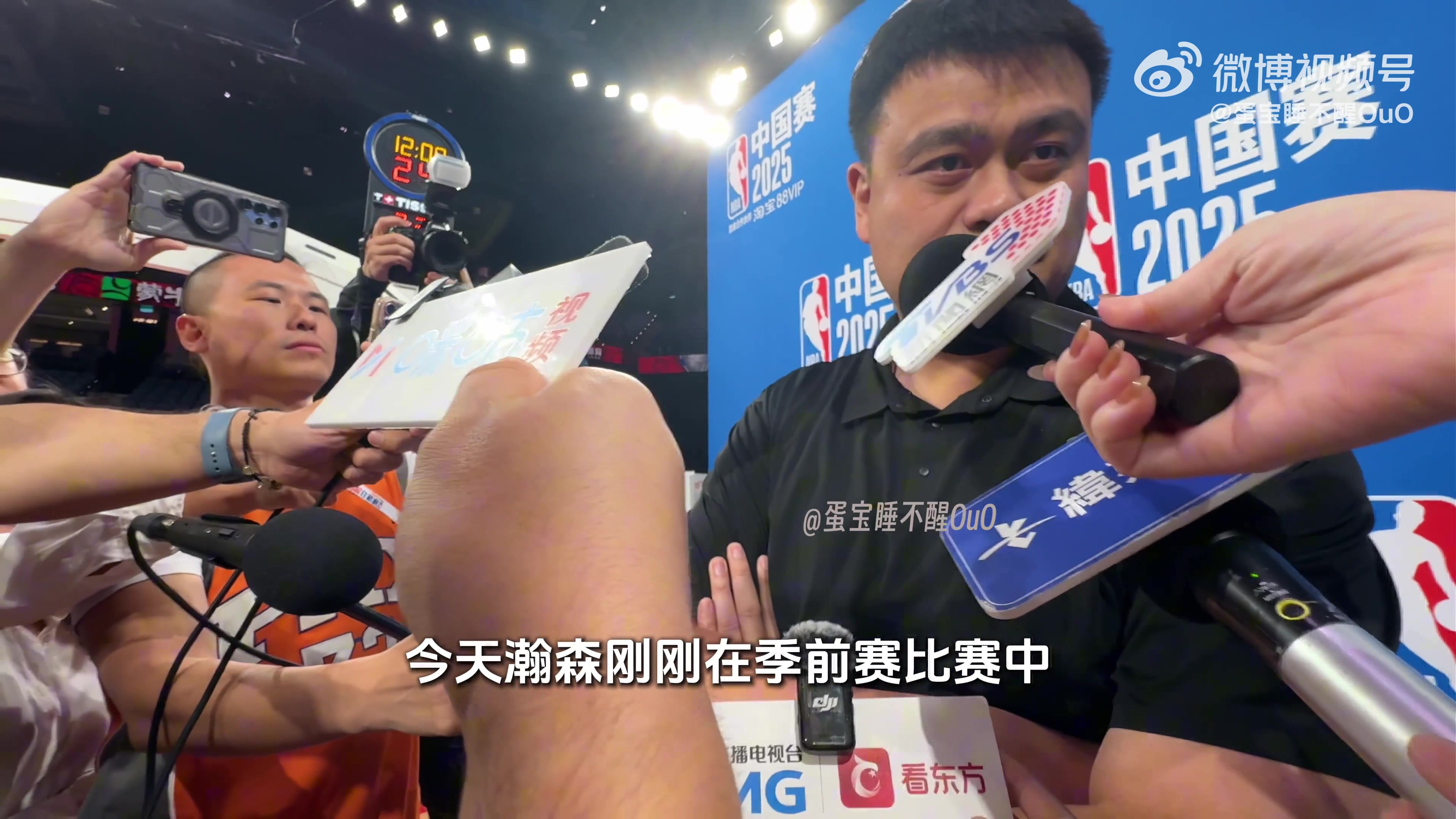 前周淑怡二台蛋宝代表上海电视台,就杨瀚森首秀对姚明进行提问,对此姚明表示:上午我了个会,错过杨瀚森首秀,希望尽快适应。