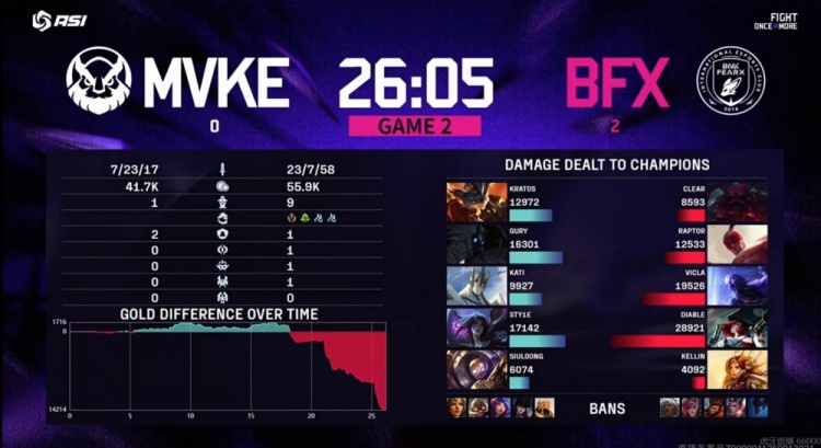 第二局前期Gury千珏连续拿下印记,MVKE一度拿下经济的领先!但是关键小龙团MVKE在少多个大招的情况下Gury千珏迟迟不开大,BFX趁机第一次团灭MVKE反超经济!随后的厄塔汗团本来Sty1e卡莎开飞想带加里奥进场,但是Diable女枪光速反应坐先锋规避控制+落地扫大拉满AOE伤害,还配合上了Clear奥恩的头槌!BFX第二次团灭MVKE拉开经济差!最终大龙团Kratos兰博被逮捕,BFX拿下大龙之后追击,本局第三局团灭对手结束比赛!小组赛全胜晋级!