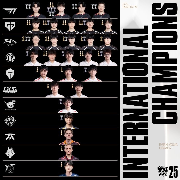 直播吧10月10日讯 英雄联盟赛事官推更新S15参赛选手的国际赛冠军荣誉榜🏆,T1选手一骑绝尘排名榜首,而Faker的奖杯数量更是远超其他选手。