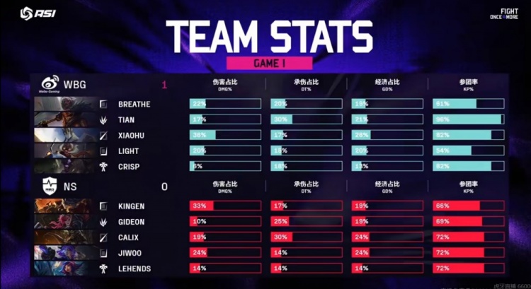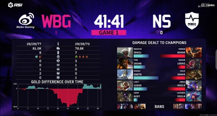 首局比赛Tian皇子前期节奏不断3-0开局,但是NS在巢虫团获胜之后依靠Calix鳄鱼的中期强势连续进攻赢团,WBG几次反击失败外塔被推,Tian皇子用命抢到厄塔汗,但是经济差一度被NS拉开到接近一万!WBG绝境拿下大龙但是被NS团灭,不过随后NS中路给机会让WBG打出0换3,随后小龙团NS拿下火龙魂但是WBG依靠Xiaohu加里奥暴力输出团灭NS拿下二大龙!决胜远古龙团Jiwoo芸阿娜连续第三次被Breathe安蓓萨大招举到,NS拿下远古龙但是正面Tian皇子给到控制,Xiaohu加里奥输出拉满配合队友再一次团灭NS,一波结束比赛,完成九千经济的翻盘!