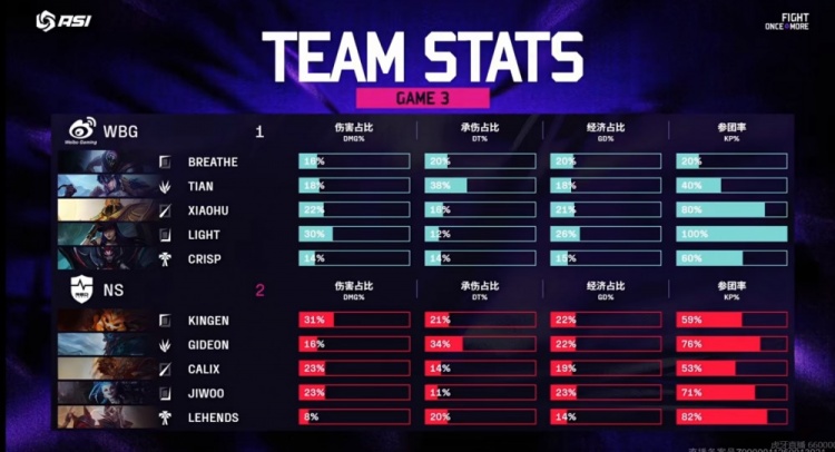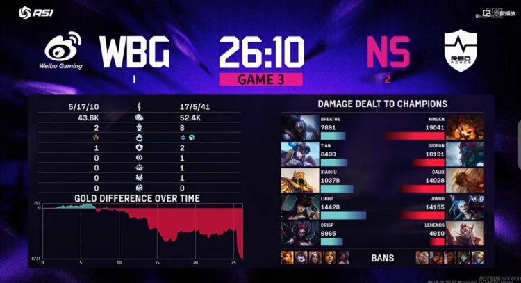 第三局WBG选出女警蜘蛛下路组,但是Light女警一波搞耍越塔白给送出一血,随后巢虫团又被巨魔卡位再死一次!前期阵亡两次的女警中期直接没了声音!上路的Kingen纳尔也是无压力发育,WBG想找机会但是被NS连续运营拆塔拉开经济差!Tian猪妹厄塔汗+大龙连续两次用命抢但是都失败了!NS拿下大龙之后逐个击破,打出0换4直接带着兵线一波结束比赛,让一追二击败WBG,晋级胜决!