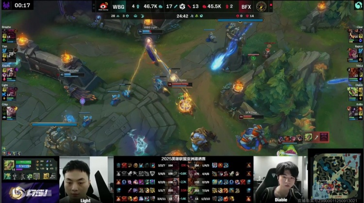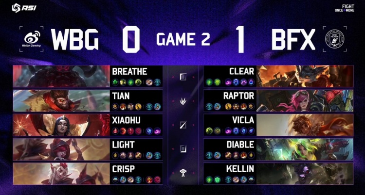 中期Xiaohu去上再抓Clear,刘神洛配合小天猴子进场双杀,WBG团灭BFX。先锋团Breathe奥恩撞飞BFX三人配合小天猴子搅两人,但Diable泽丽开大反杀Breathe稳住局势,双方经济持平。
