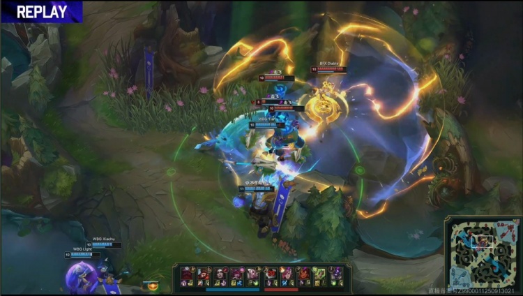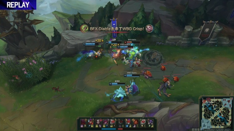 【19:49】WBG继续中路推进,野区混战,Raptor换掉刘神,BFX四人追击,Breathe奥恩半血拉开,BFX经济落后500块。