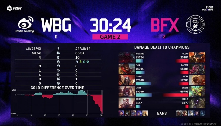 第二局前期WBG三人中路抓掉Vicla一血后,Xiaohu妖姬马不停蹄去上联手Breathe击杀Clear兰博,紧接着小天再来中路逮捕Vicla。小龙团Raptor蔚锁头xiaohu,Diable泽丽爆轰三杀,BFX打出0换4,经济反超2k。