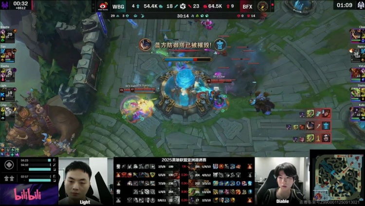 【23:34】Breathe奥恩下路被BFX四人越塔融化,BFX推掉WBG下路二塔,WBG推掉BFX上路二塔,BFX经济落后2k。
