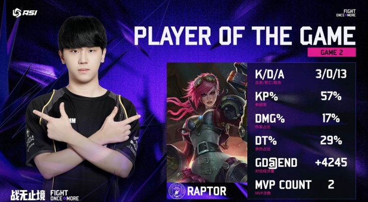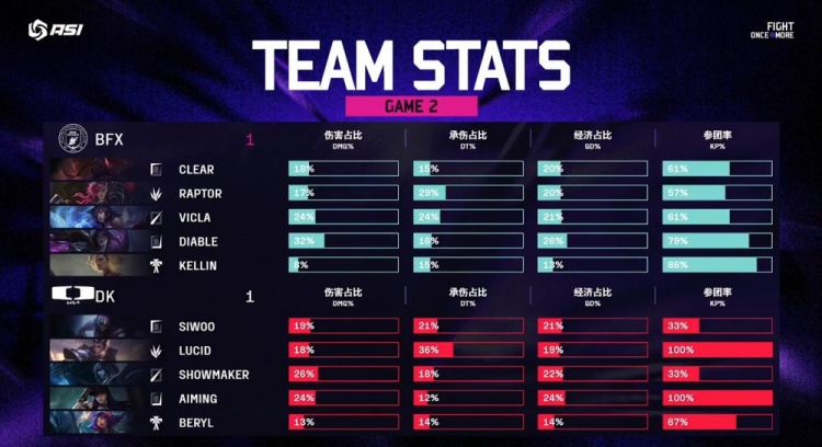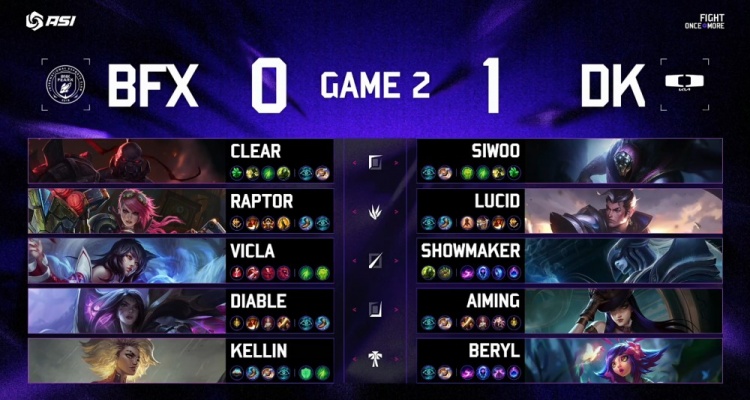 后期DK正面毫无一战之力,BFX在野区团战中继续扩大优势,BeryL妮蔻开BFX三人无济于事,Diable卡莎收获双杀,后续BFX轻松0换4回头吃掉大龙,经济优势来到1w以上。最终,BFX三路推进,Diable卡莎四杀收尾,BFX一波推平DK基地,扳回一城。