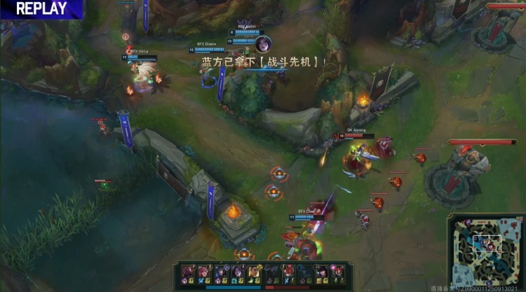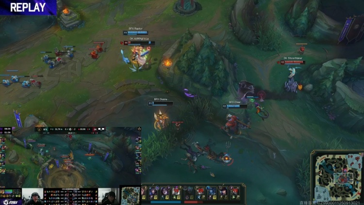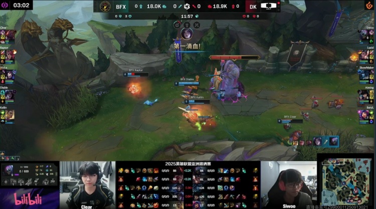 【11:50】BFX四人去上越塔逮捕Siwoo,Diable卡莎拿到一血,Lucid赵信拿到小龙,Aiming女警推掉BFX下路一塔,DK经济领先1k。