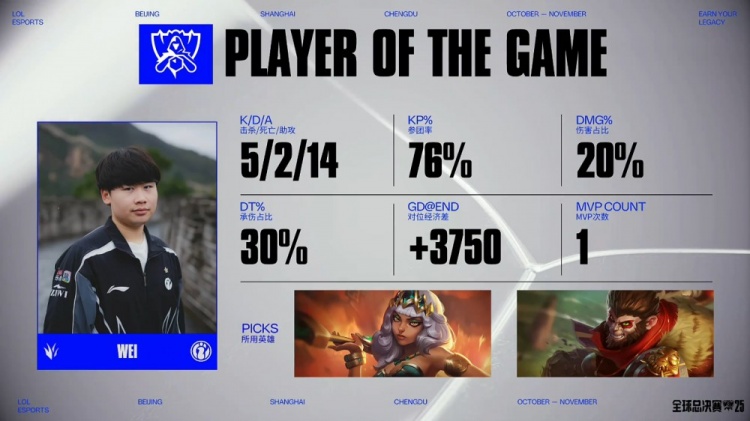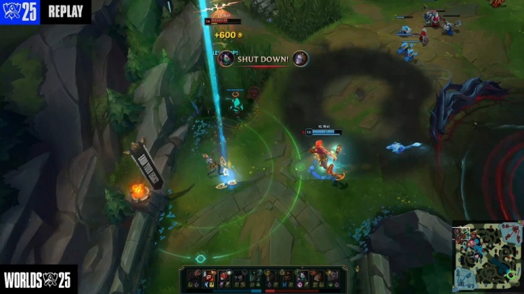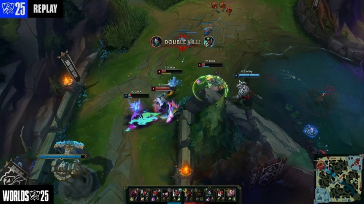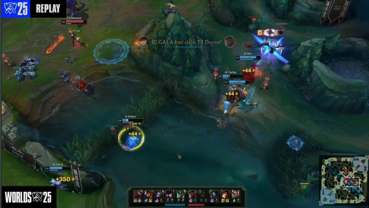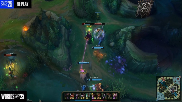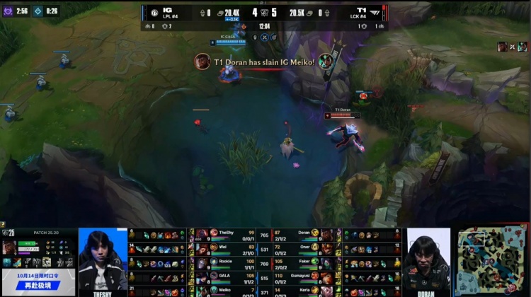 【8:53】河道团战,Rookie发条拉T1两人,Keria洛被Meiko卡尔玛W定住,Wei猴子一棒敲掉Keria一血,iG经济领先1k。